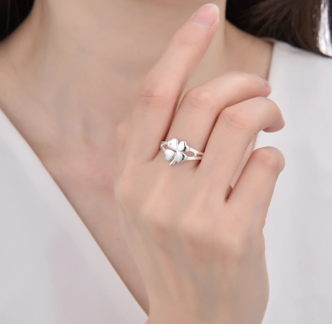 Anillo de tamaño pequeño con gema clara en hoja de trébol, ideal para uso diario