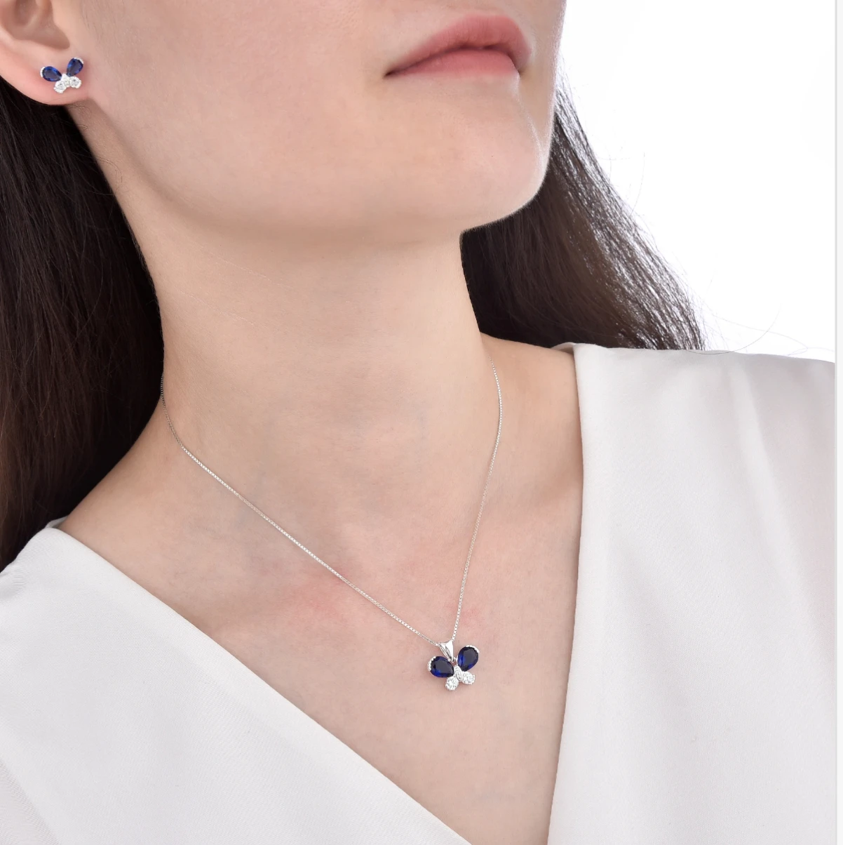 Elegante juego de pendientes y colgante en forma de mariposa con piedras preciosas azul y cristal claro