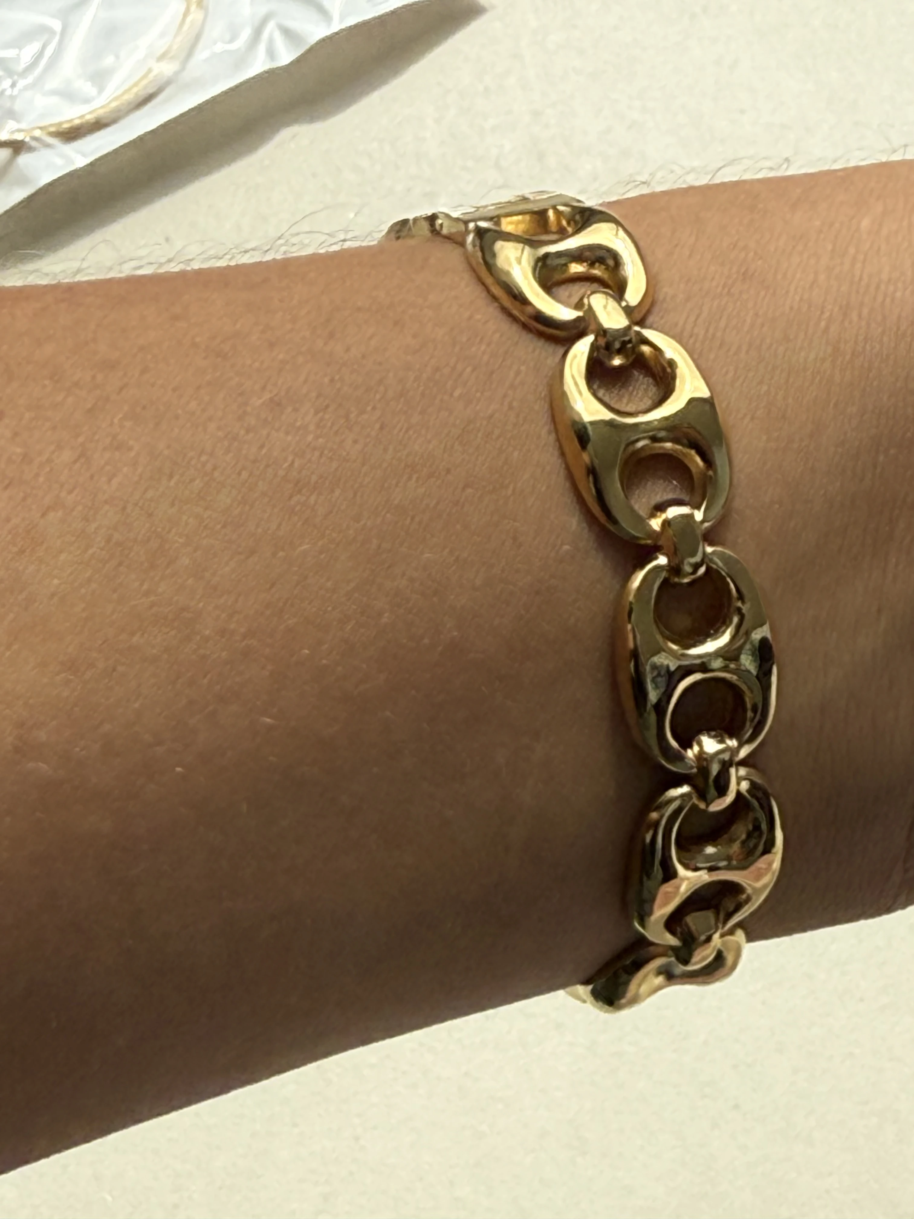 Pulsera de Enlace: Eleva tu estilo con esta pulsera de enlaces dorados. El diseño audaz y elegante se compone de grandes eslabones interconectados, fabricados en acero y bañado en oro con un acabado dorado brillante. Perfecta para cualquier ocasión, desde eventos formales hasta salidas casuales, su textura pulida añade un toque sofisticado. Ideal para aquellos que buscan un accesorio llamativo que se adapta cómodamente a la mayoría de las muñecas.