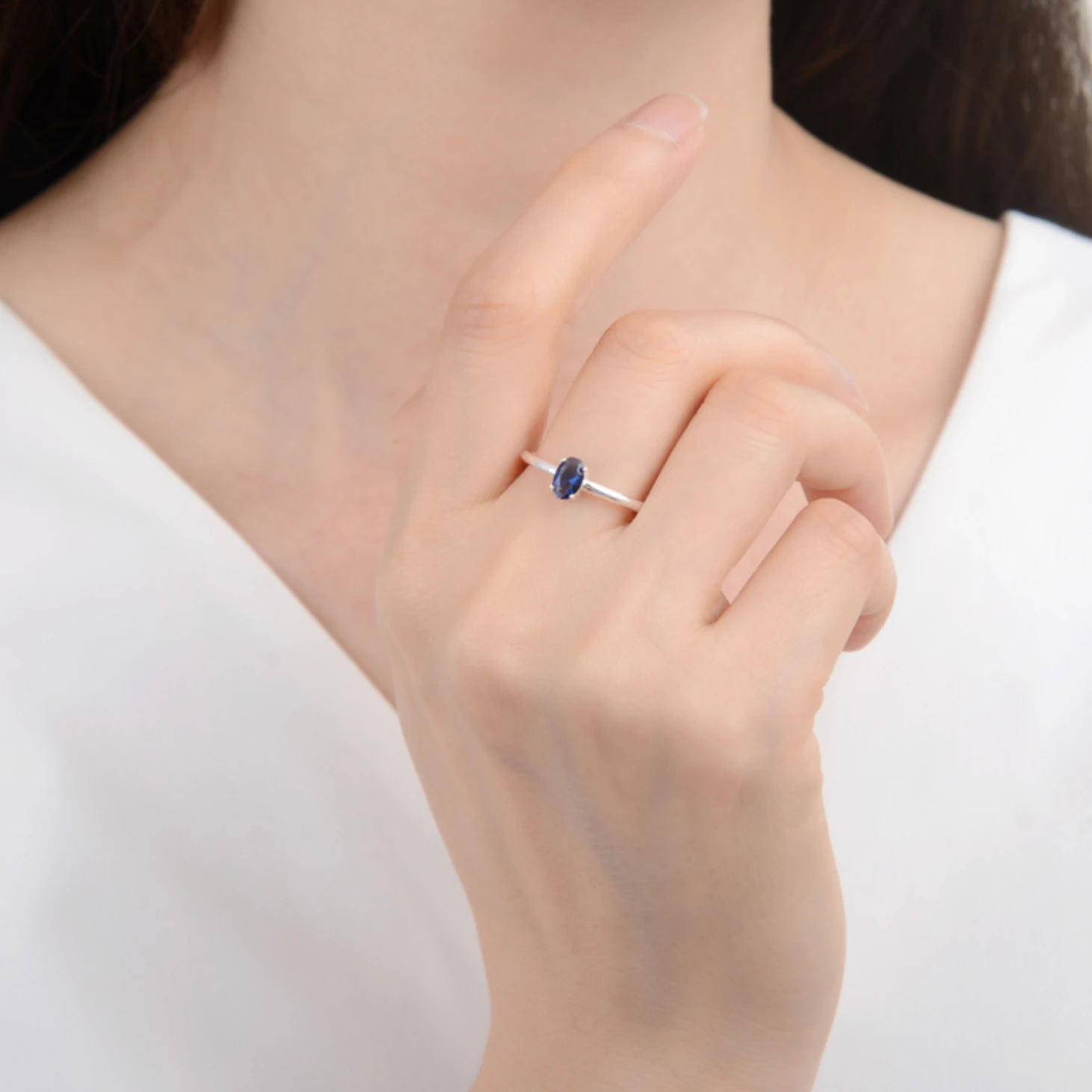 Anillo de plata esterlina con gema azul ovalada, diseño minimalista perfecto para destacar