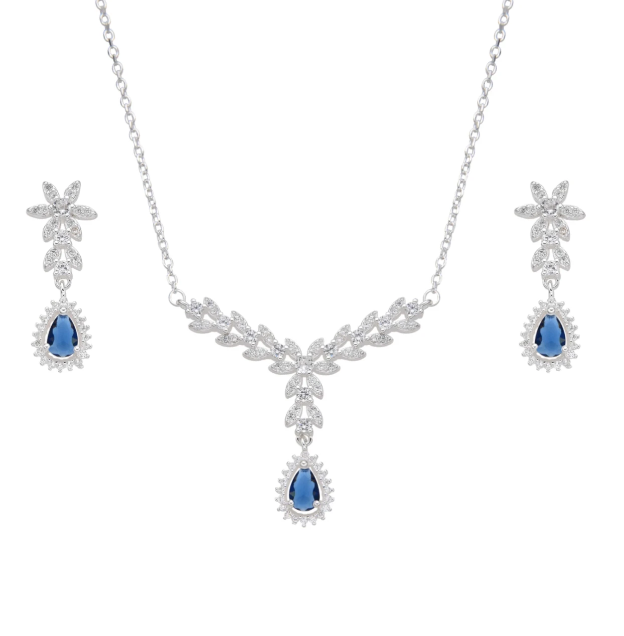 Descubre la sofisticación y elegancia con este conjunto de joyas de plata y piedras preciosas azules. Este set incluye un collar y aretes a juego, destacando un diseño floral y de hojas con piedras claras brillantes y gemas azules en forma de lágrima como pieza central. Fabricado con metal de plata de alta calidad, ofrece un acabado brillante y lujoso. El collar cuenta con una cadena delicada, mientras que los aretes cuelgan con gracia. Ideal para realzar tu estilo en ocasiones especiales, su diseño audaz y refinado añadirá un toque de distinción a cualquier atuendo.